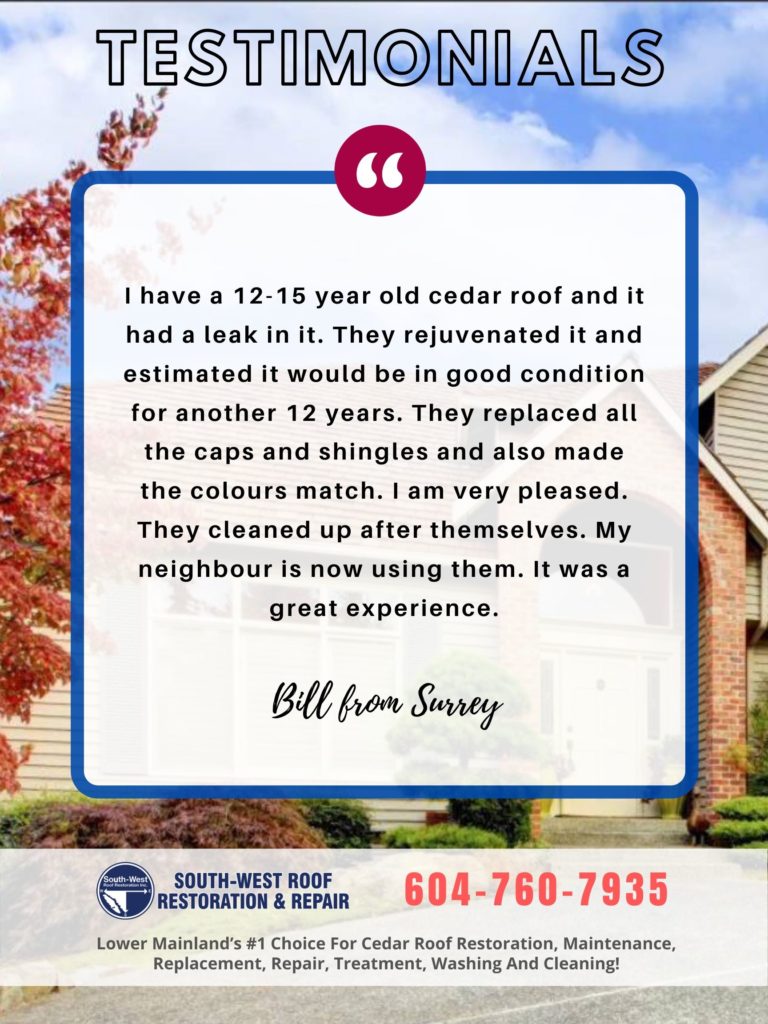 SouthWest have just completed our cedar shake roof restoration in Tsawwassen and we couldn’t be more pleased. It was completed exactly as promised and the quality of the work was beyond expectations. If you want a job done right with a … More contractor you can trust, at a reasonable price, these are your people. We unequivocally endorse them. -