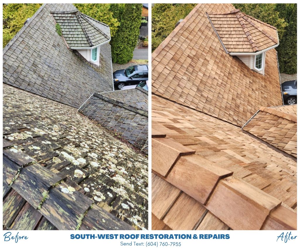 #1 Cedar Roof Repairs, Washing & Treatment company for Lower Mainland South-West Roof Restoration Inc.’s highly trained staff professionally remove moss, mold, mildew, fungus and debris from your cedar roof,